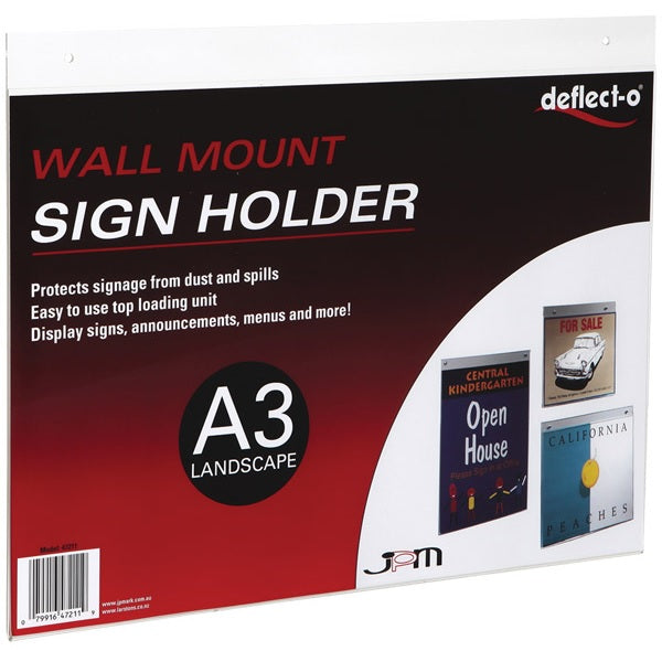 Deflect-o wall mounted top loading single sided display sleeves are designed for displaying menus, fire regulations, OSH signs, staff information, property listings or any other important message for your staff or customers. Manufactured from injection moulded crystal clear plastic, these display sleeves are an economical and space efficient way to promote your key messages.