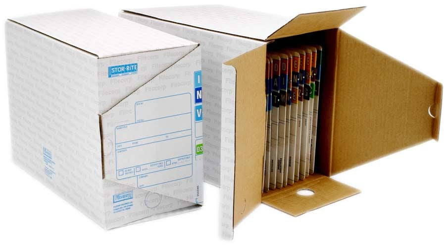 This is an end opening self stacking storage box specially designed to store semi-active or inactive records without the need for expensive shelving. The boxes are double the normal file box size and designed to take Filecorp, Dalton and Codafile lateral colour coded file covers. Manufactured in strong corrugated board to enable the boxes to be stacked on top of one another up to 8 x boxes high. The end opening access to the box contents means that records can be retreived without having to remove the box from the stack.