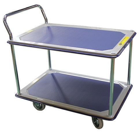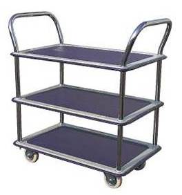General purpose pressed steel industrial strength 2 and 3 level Trolleys for transporting goods safely in the workplace. Large vinyl coated decks for corrosion-resistance and to help prevent shelf contents sliding when the Trolley is in motion. Ideal for catering, kitchen or general office use