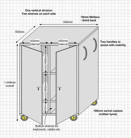 Any design of melteca cupboard, bookcase or compartment unit can be custom built and fitted with castors for mobility. The back of the unit can have power cutouts for storage (and charging) of computer monitors or laptops, along with a secure lockable area for keyboards, cables and other miscellaneous IT equipment. Also suitable as a TV monitor stand.