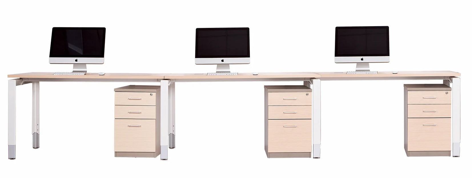 Create a collaborative team environment with the Three Person Straight Height Adjustable Desk in soft maple. The height adjustable desk with telescopic legs offers the appearance of three large lavish office desks side-by-side, while still optimising your office space. With a scallop feature at the rear of each workspace, you can keep your desk free of messy cables and whilst also facilitating the addition of clamp-on accessories like monitor arms. By adjusting the desktop to suit your height, you can be ergonomically supported throughout the day. Tops are now available with antimicrobial tops to help stop the spread of diseases in your workplace