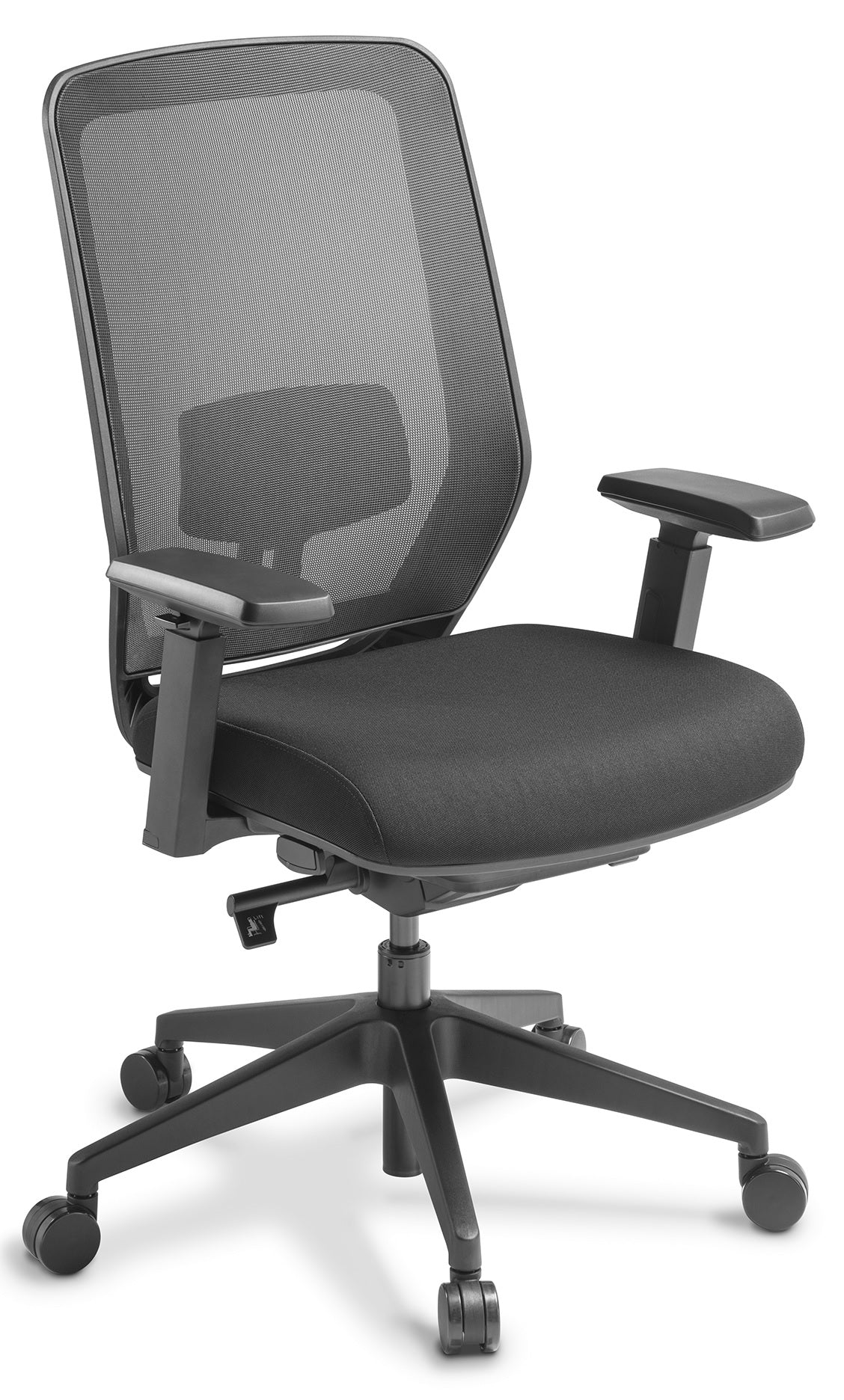 Deluxe comfort seating with simple body-responsive support movement. Pilot is generous and comfortable with a broad-support backrest and plush padded seat. The user-freindly mechanism features a self-adjusting synchro movement, with back and seat moving together, naturally responsive to your body weight. It allows a relaxed supportive floating tilt or can be locked in three positions. Pilot is upholstered in a smart black polyester fabric.