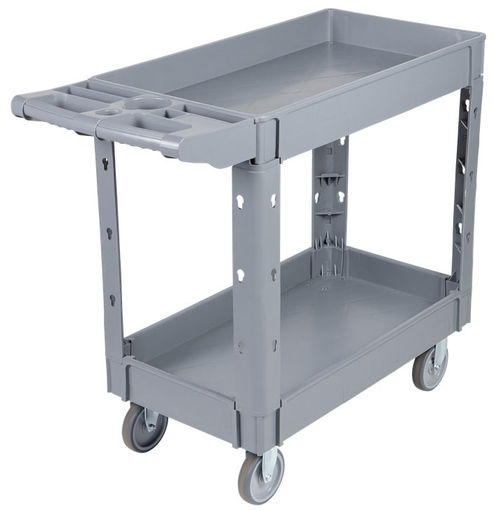 Compact, strong, durable and versatile two level heavy duty plastic service Trolley ideal for hotels, motels, cleaners or just for general office use for transporting miscellaneous items around the office. Check out the range of size and shelf options available now!