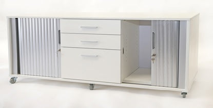 When you combine the strength and versatility of a colourful melteca exterior with the quality and style of white or silver PVC Tambour (slat) doors you simply create the best looking storage facility for your office. The Accord range of caddy's and cabinets will give any reception or general office area a real lift. Available in a choice of sizes, colours and configurations