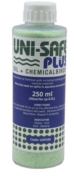 Uni-safe Plus is a chemical and oil binding medium universally applicable to all liquids - including oils, hydrochloric acid and even fuming nitirc acid. Super efficient and absorbing up to 75 times its own weight - 1kg absorbs up to 75 litres of spill. Available in 250ml and 1000ml bottles and a 5kg container